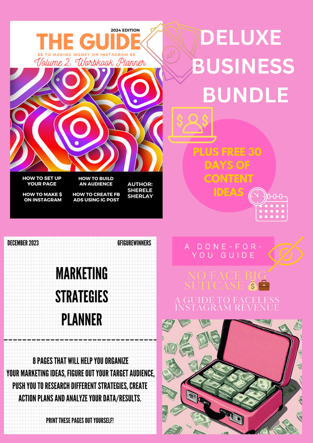 This bundle will include The Guide to Making Money on Instagram workbook, NO FACE BIG SUITCASE 💰💼 A Guide to Faceless instagram REVENUE ebook, 30 days of Content Ideas and the Marketing Planner. Utilizing all three of these digital products will take your brand to the NEXT LEVEL! You don't have to start from scratch we've done the WORK and RESEARCH for you!